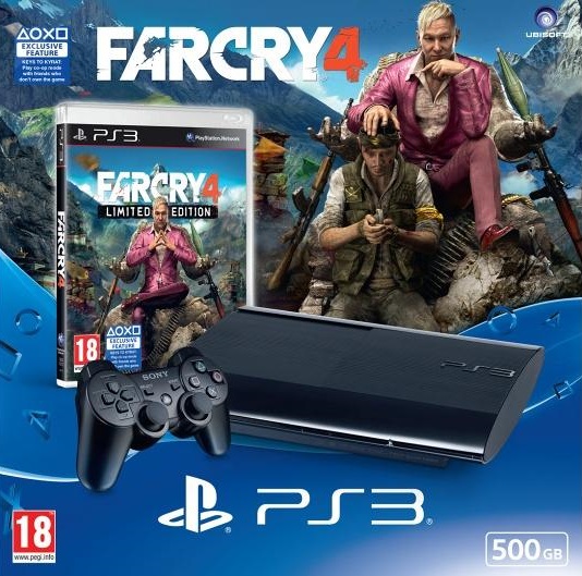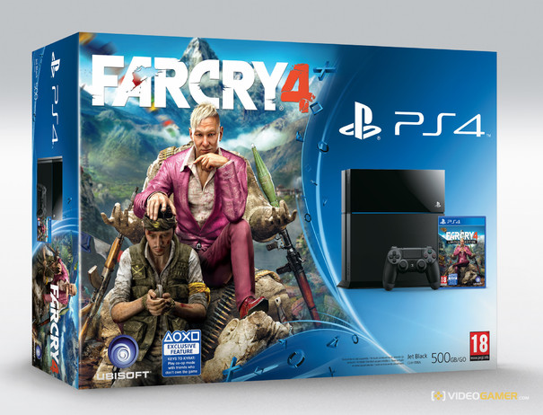 Far Cry 4: A Ubisoft anunciou que o jogo virá em pacotes especiais em versões que trarão o último modelo do PlayStation 3 e também , edição especial com copia do jogo e ps4 com o modelo padrão black piano e o modelo cristal White do console de ultima geração da sony porém de começo a oferta só esta valida para Europa